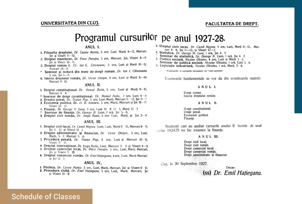Second Year: Constitutional Law (Romul Boilă), Criminal Law (Traian Pop), Political Economy (Dumitru B. Ionescu), Finance (George N. Leon), Romanian Civil Law (Iorgu Radu)