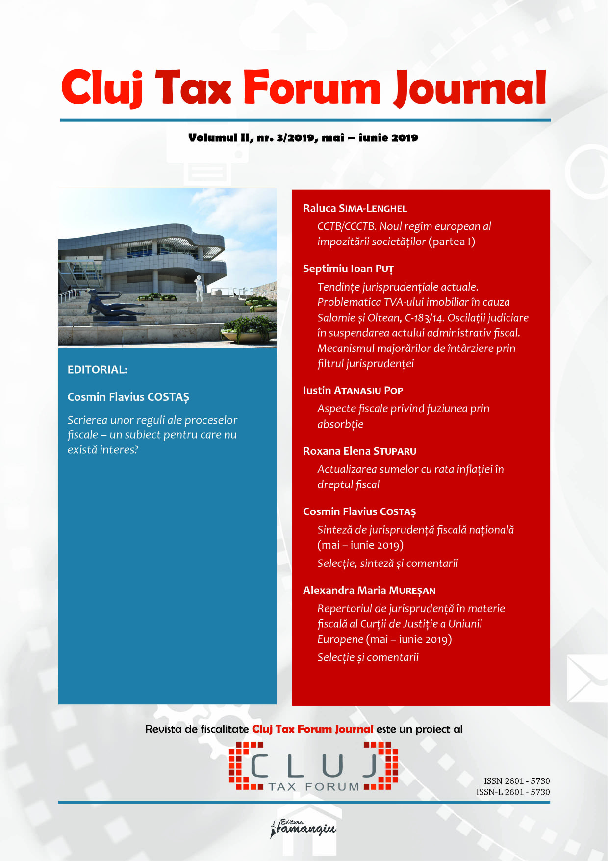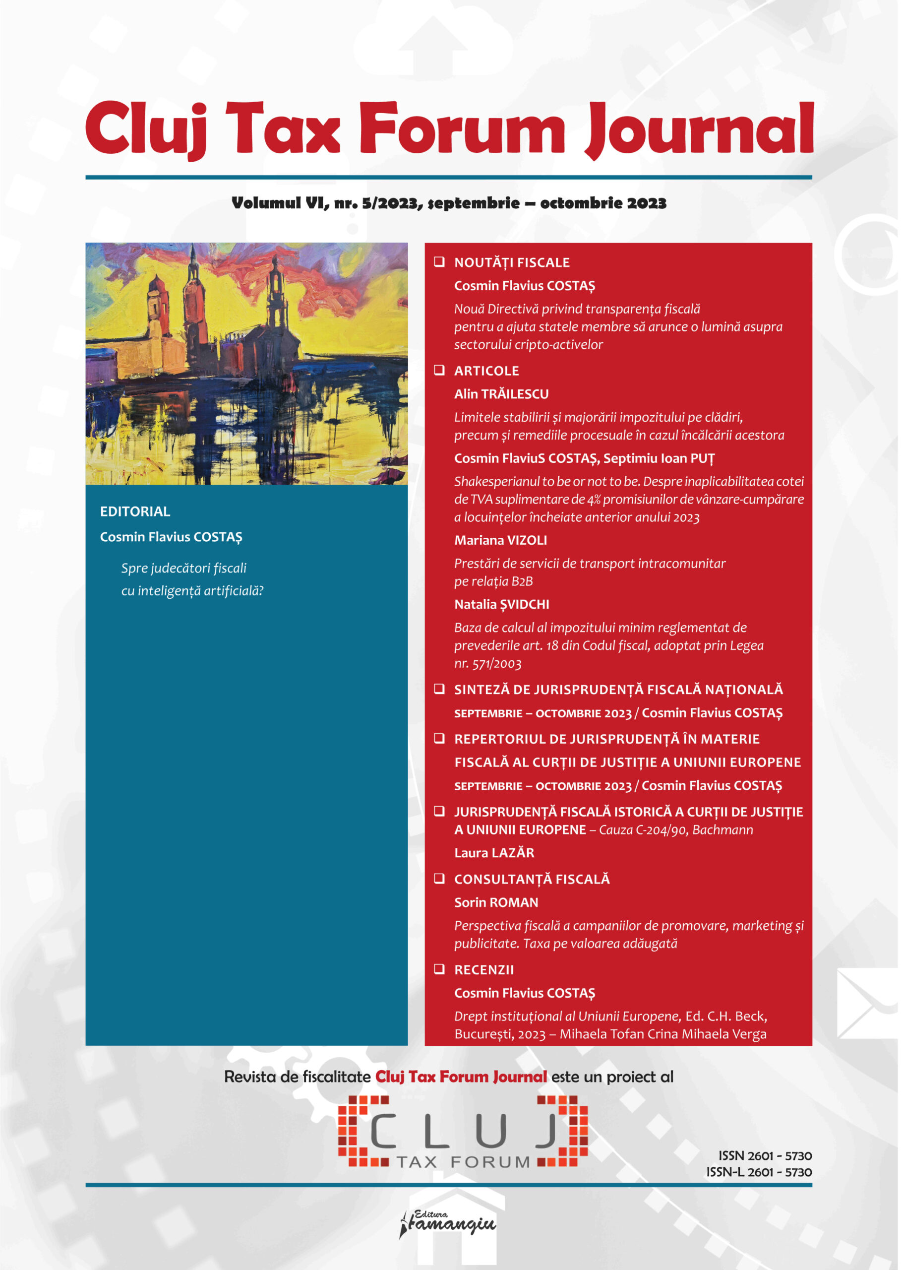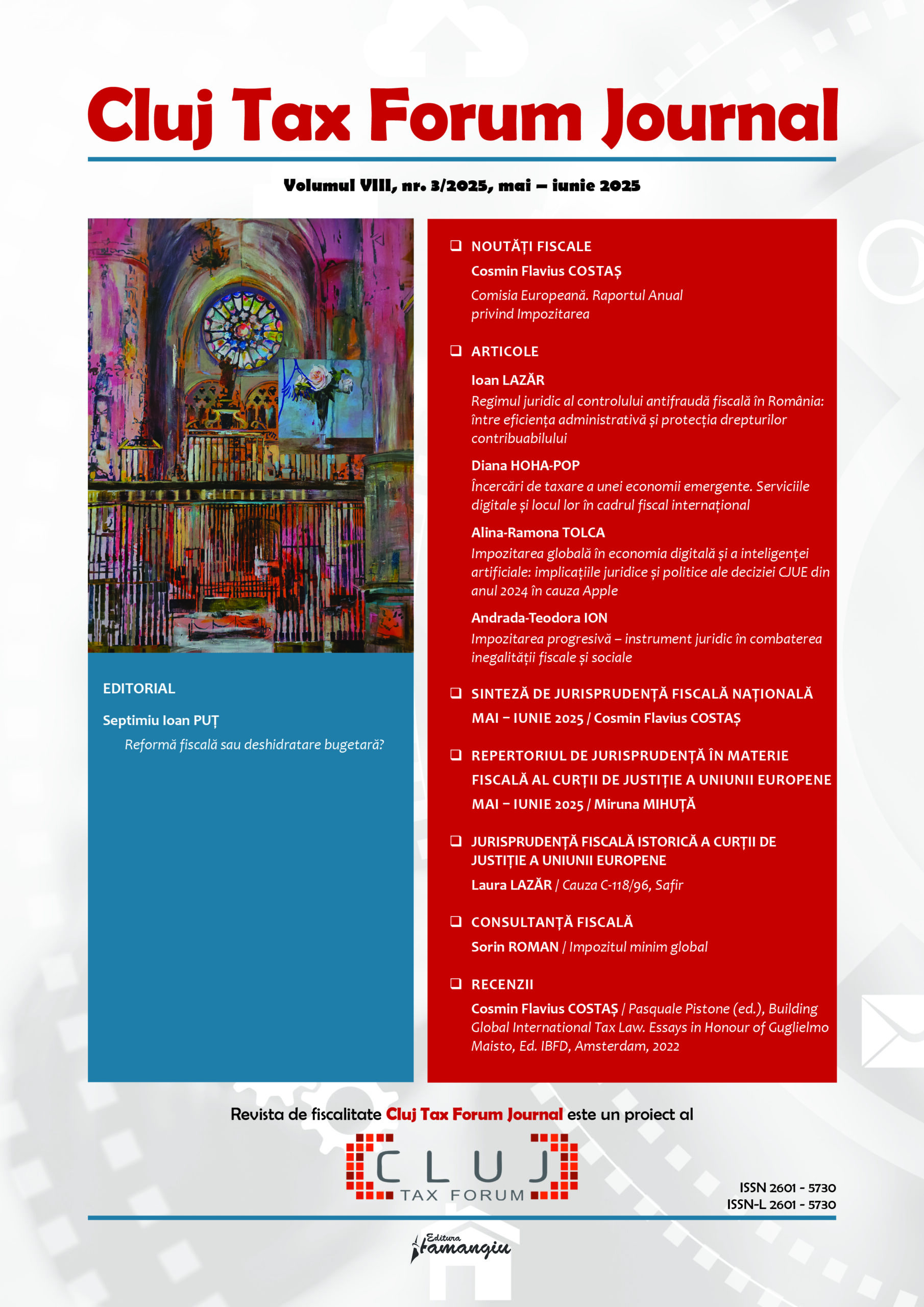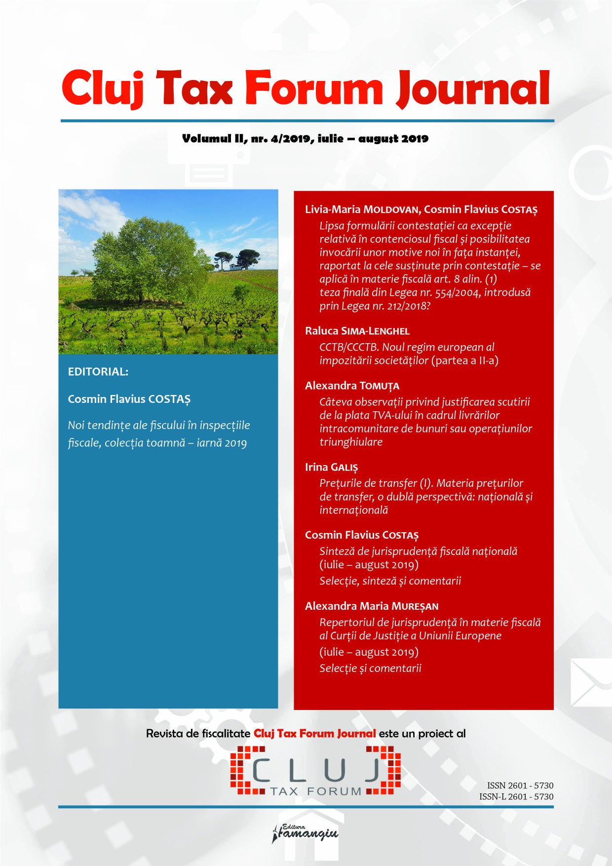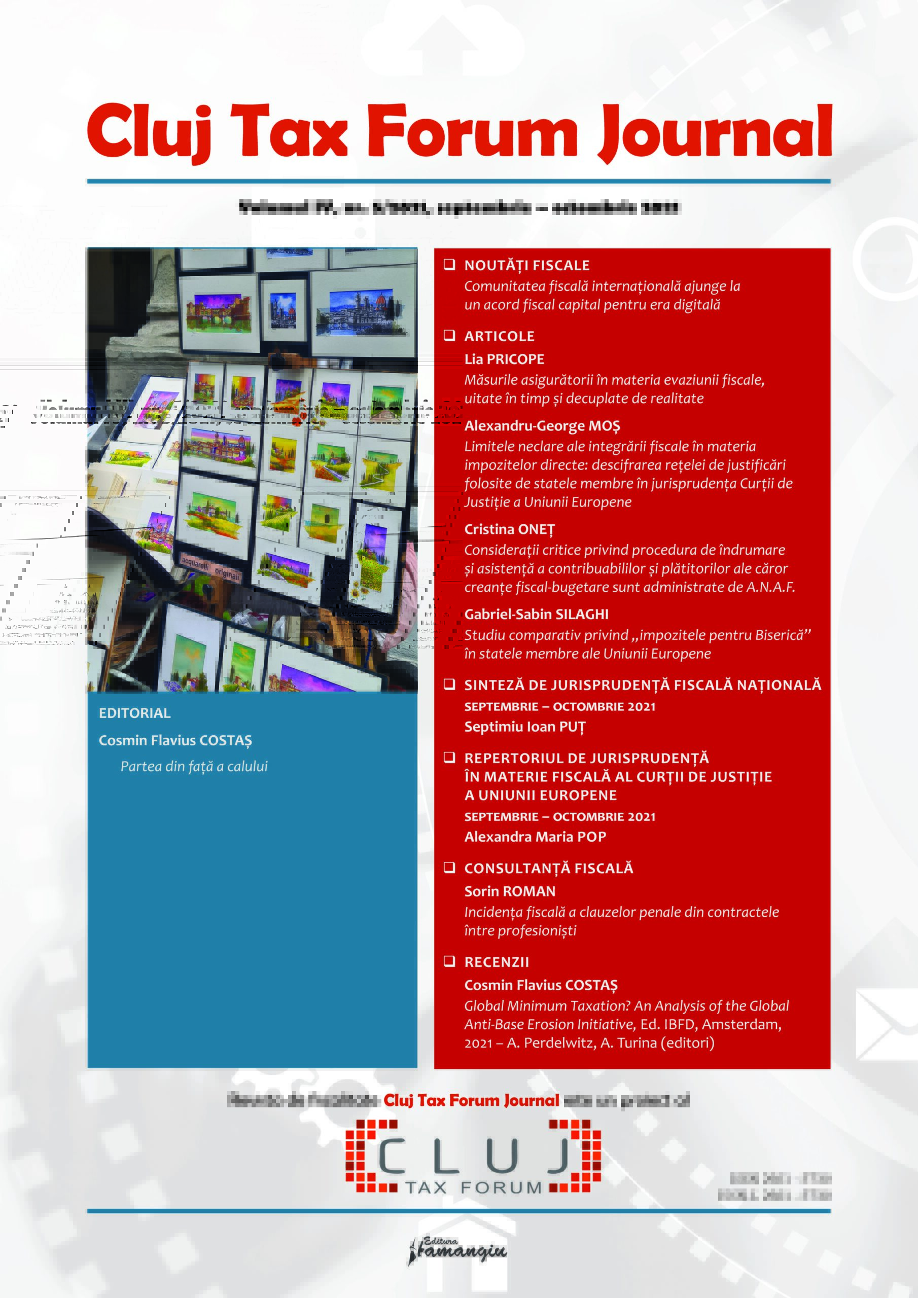 Revista Cluj Tax Forum Journal apare cu începere din anul 2018, în marja seriei de conferințe de fiscalitate Cluj Tax Forum. De la început, revista și-a propus să ofere oportunități de publicare atât cercetătorilor consacrați, din țară și din străinătate, cât și tinerilor studenți, masteranzi sau doctoranzi. Cluj Tax Forum Journal apare bilunar, în format tipărit pe hârtie, la Editura Hamangiu (pentru detalii și abonamente, https://www.hamangiu.ro/periodice).
