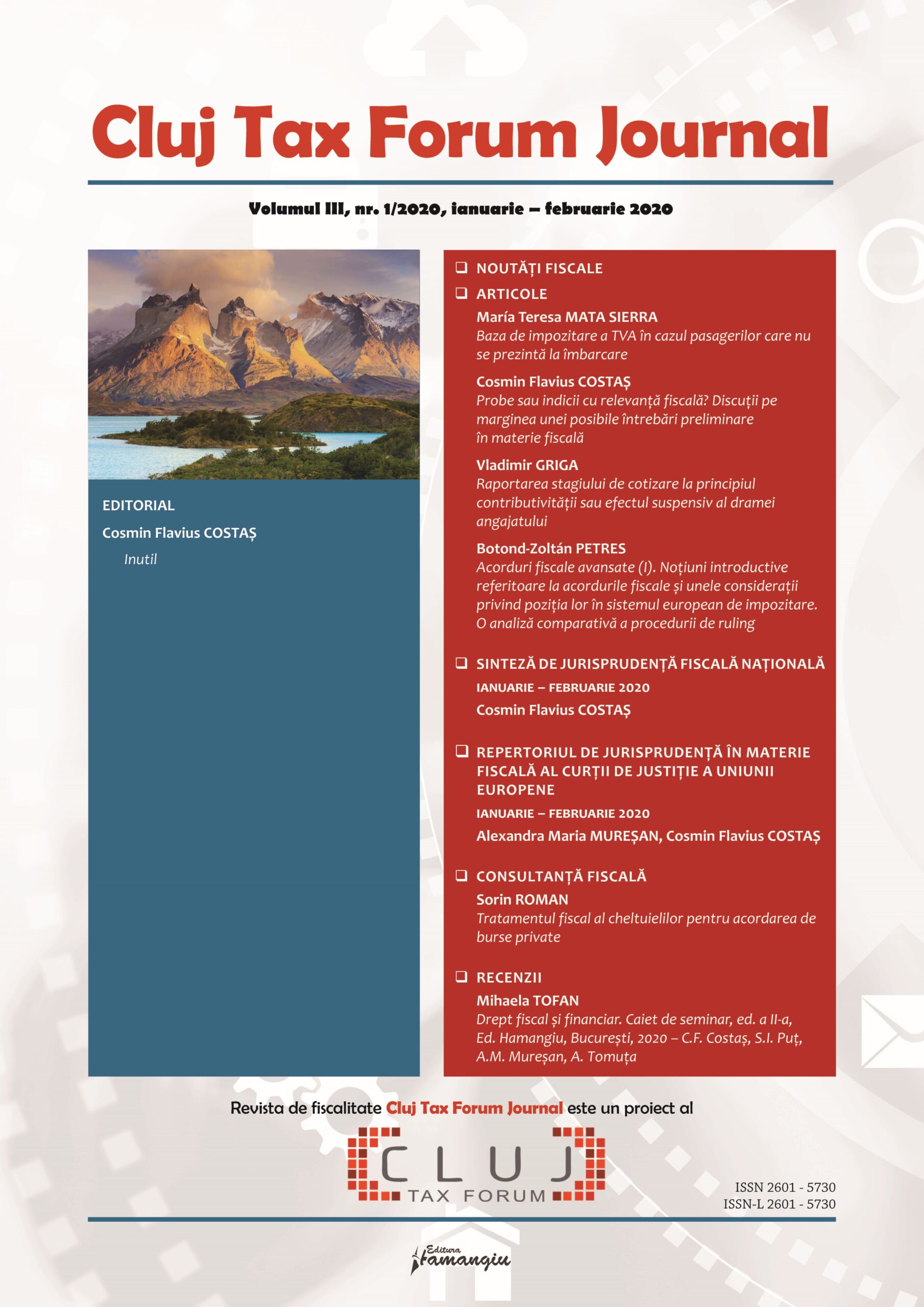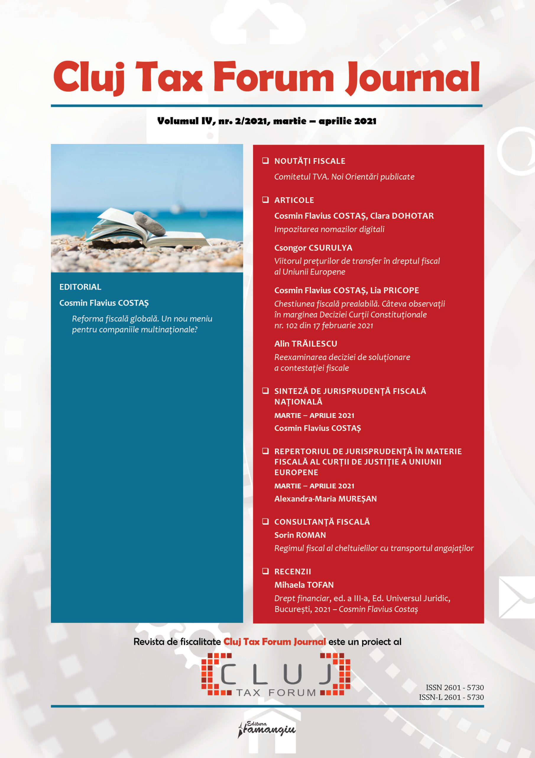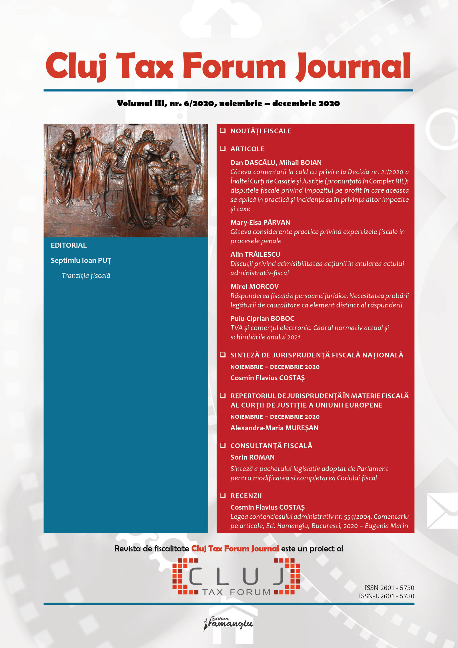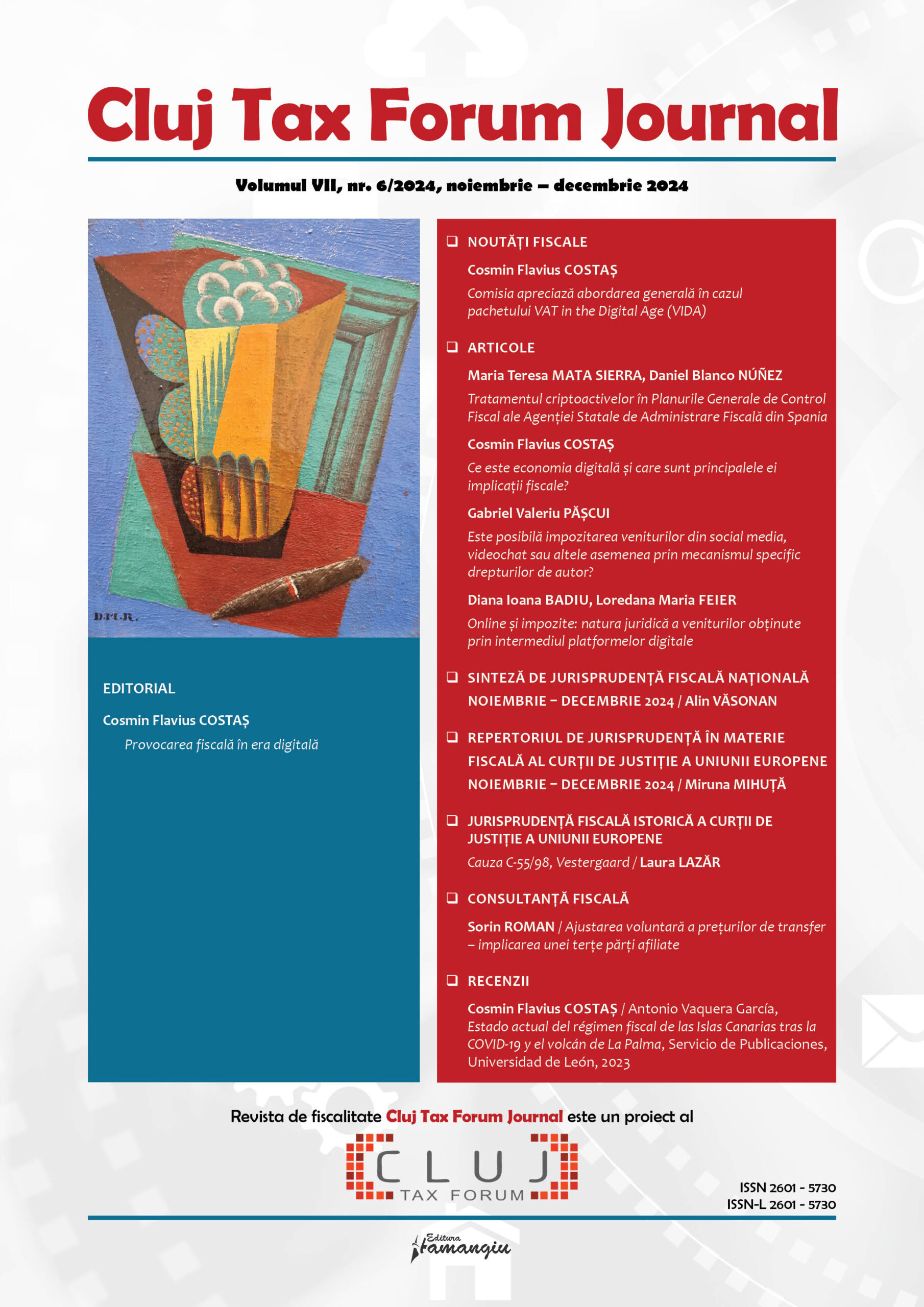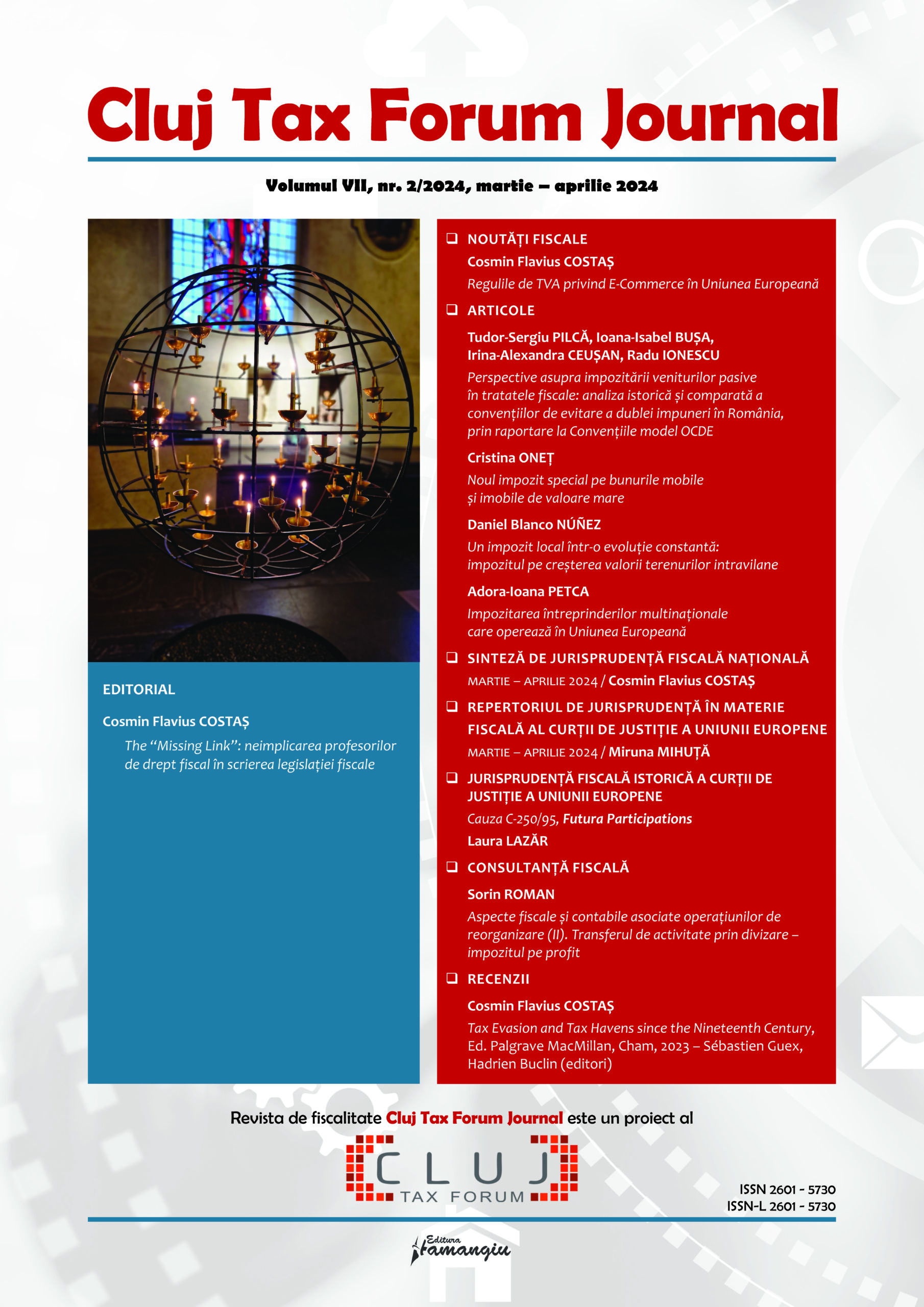 Revista Cluj Tax Forum Journal apare cu începere din anul 2018, în marja seriei de conferințe de fiscalitate Cluj Tax Forum. De la început, revista și-a propus să ofere oportunități de publicare atât cercetătorilor consacrați, din țară și din străinătate, cât și tinerilor studenți, masteranzi sau doctoranzi. Cluj Tax Forum Journal apare bilunar, în format tipărit pe hârtie, la Editura Hamangiu (pentru detalii și abonamente, https://www.hamangiu.ro/periodice).