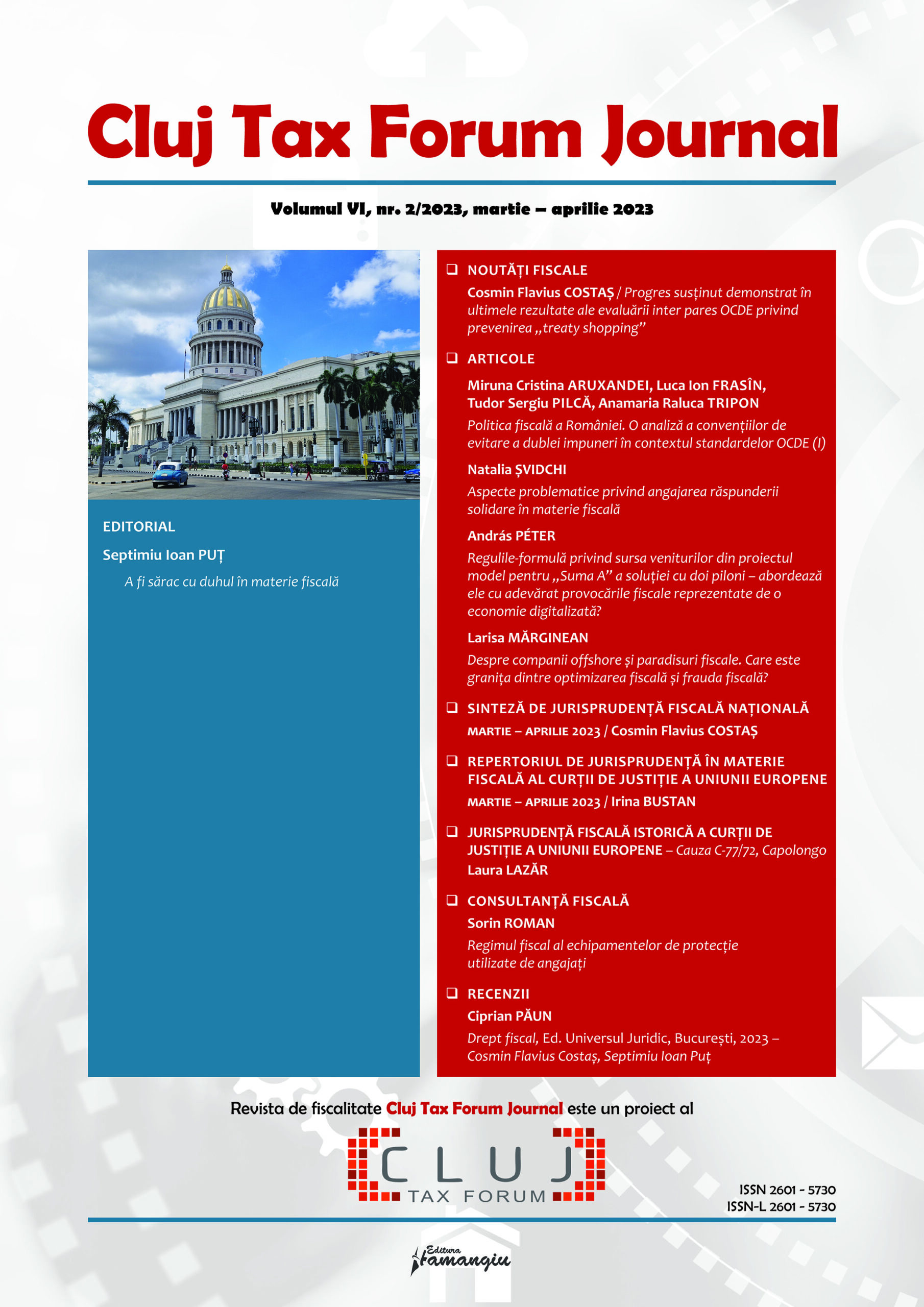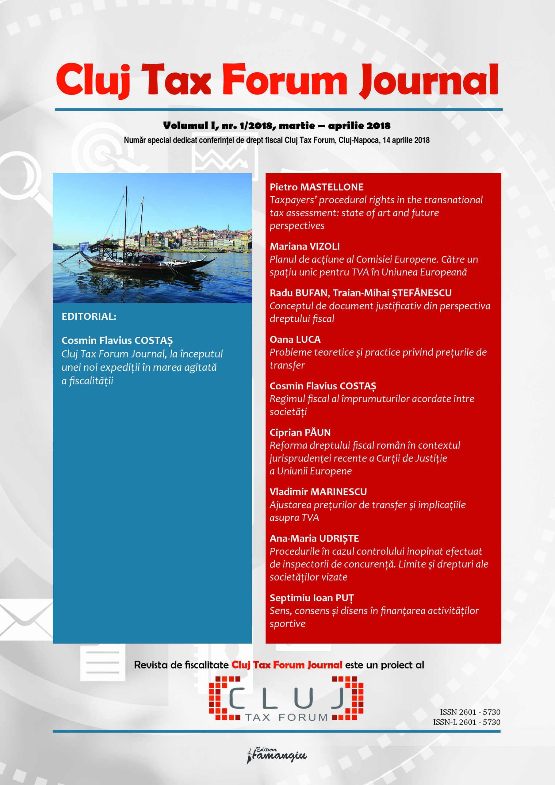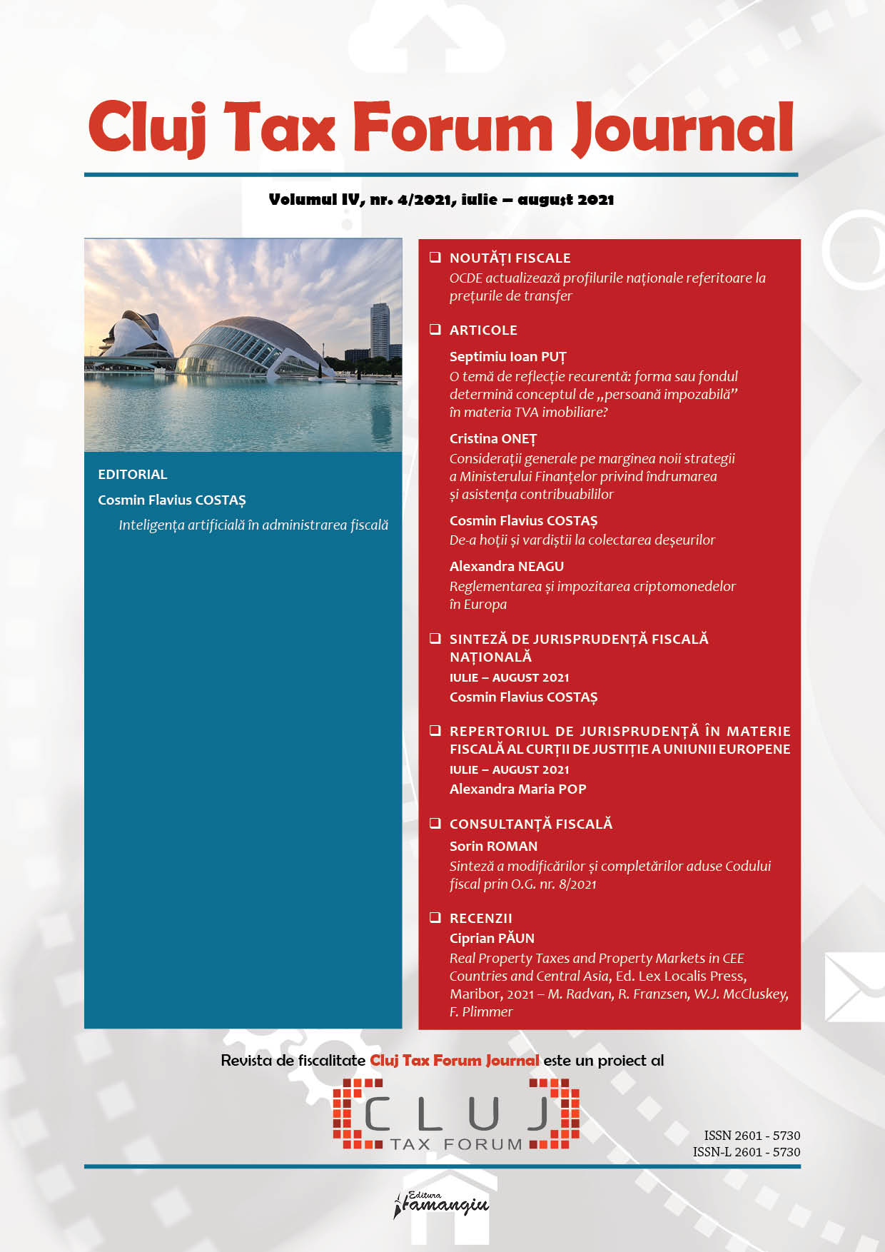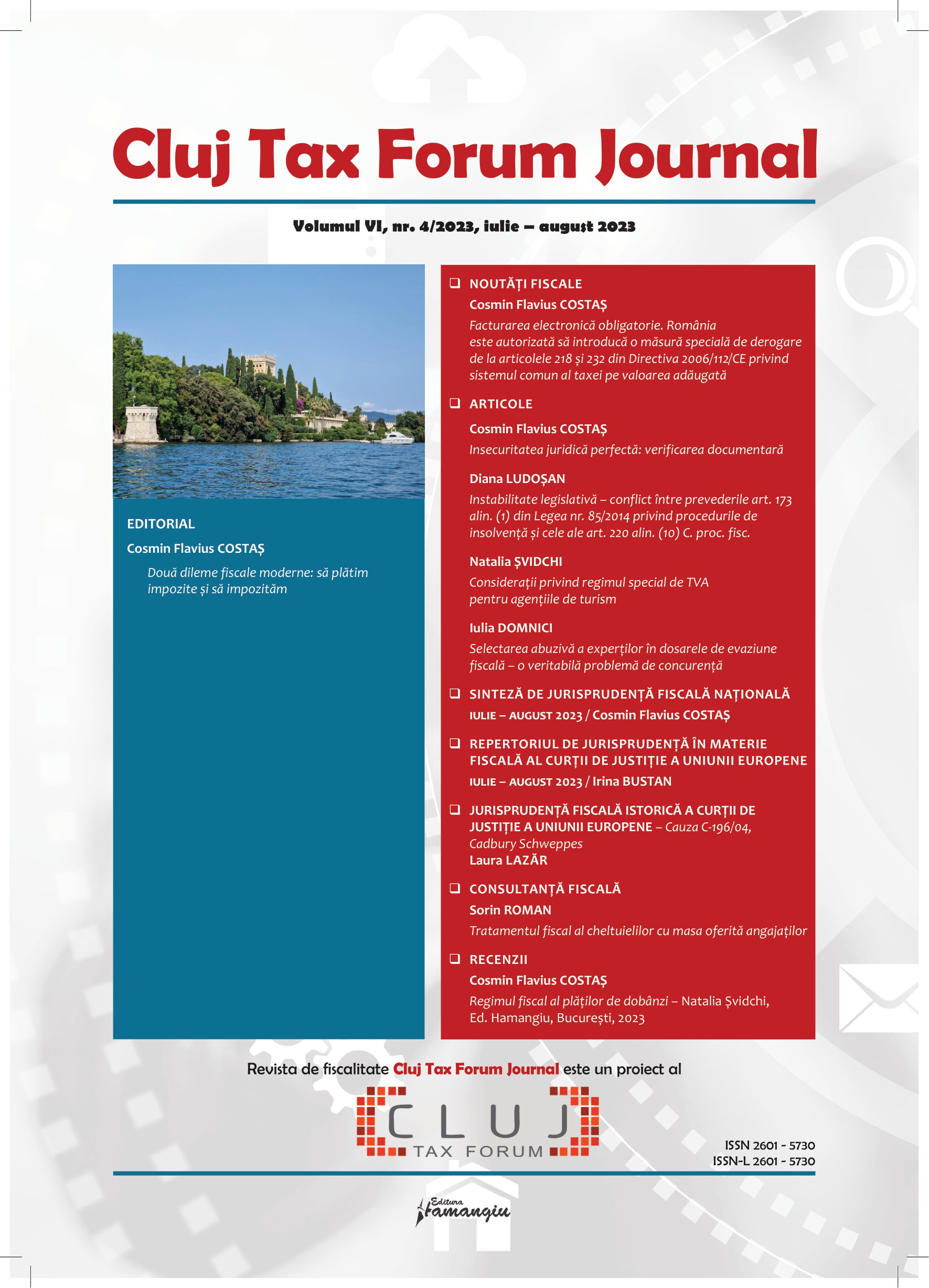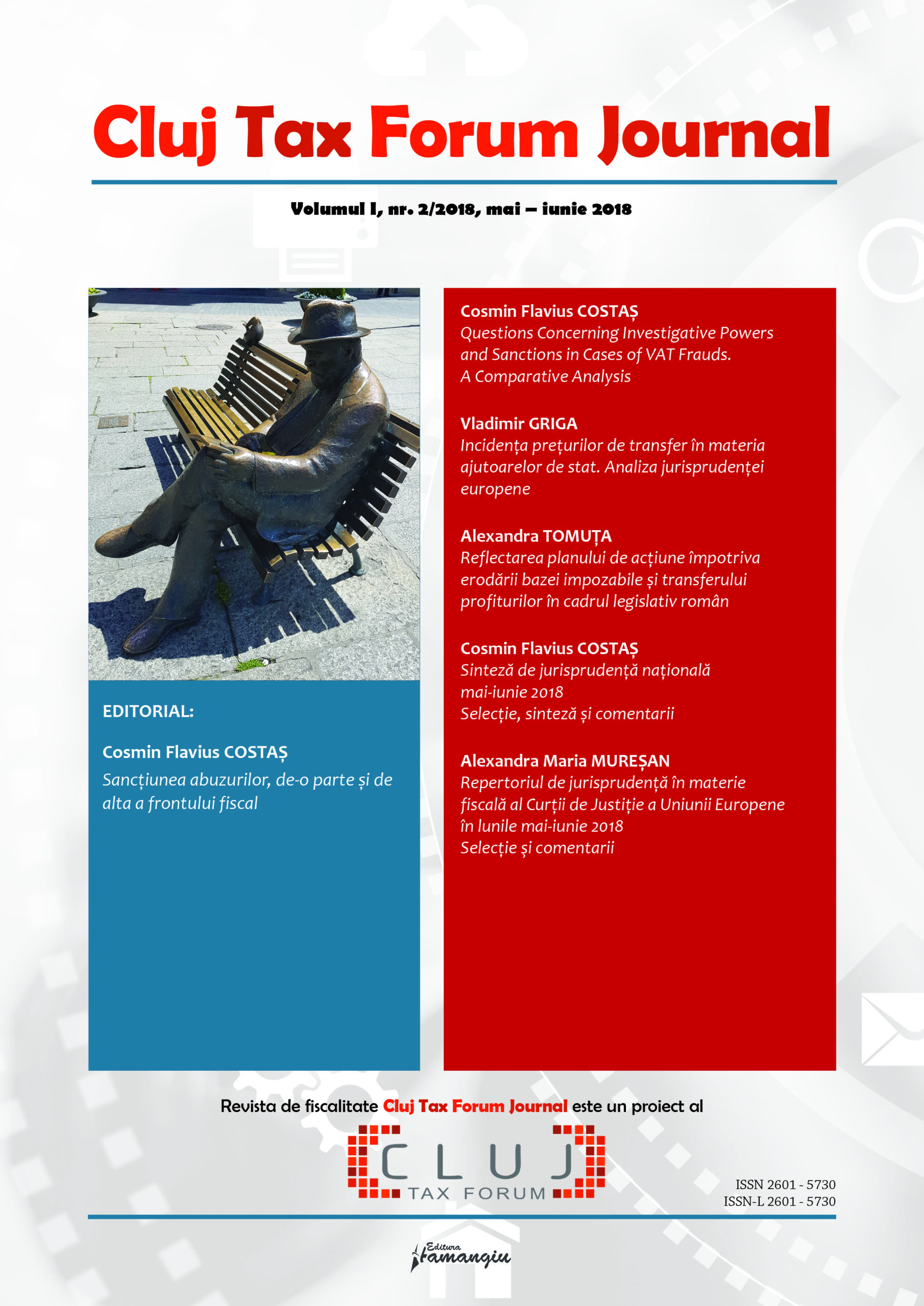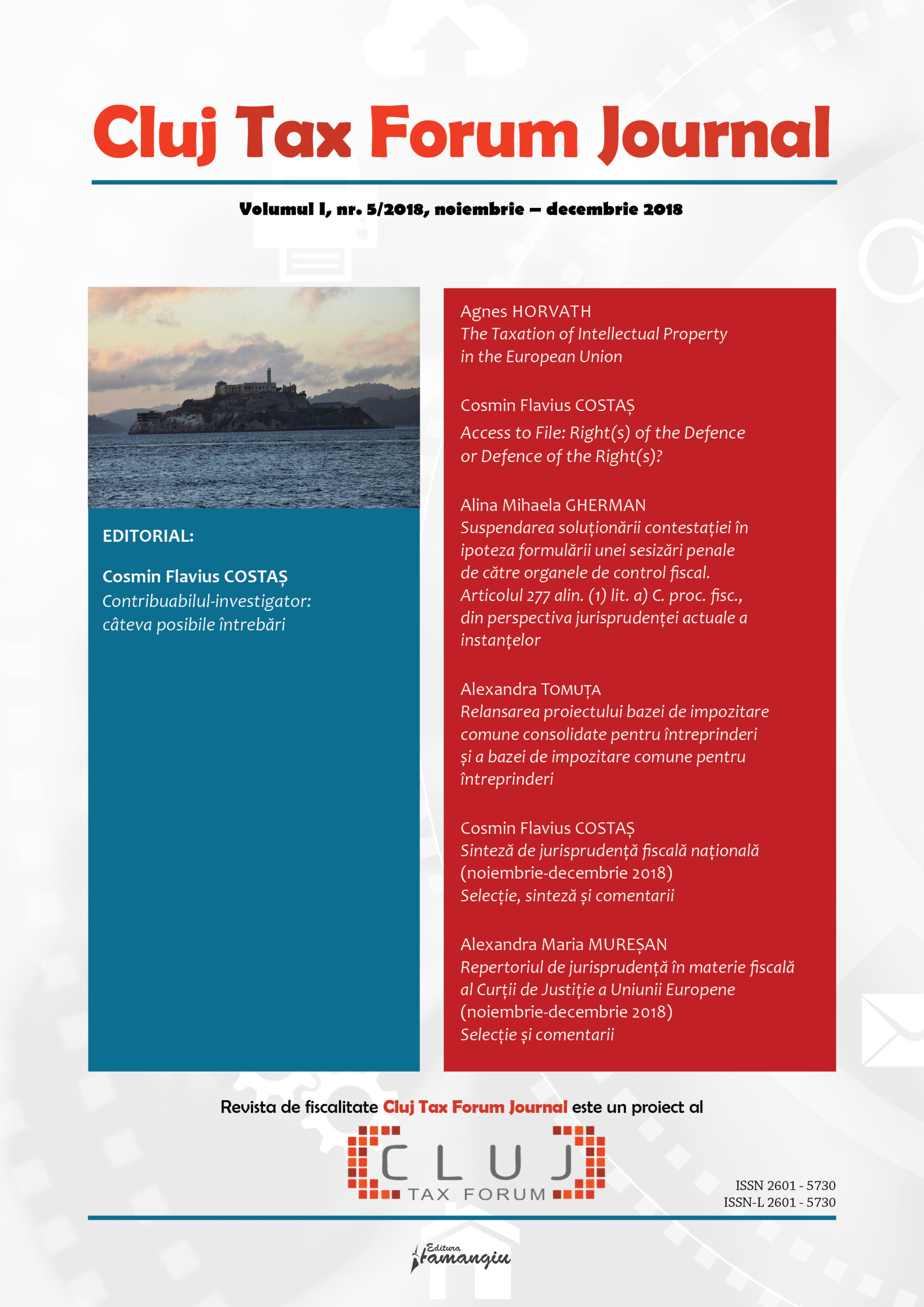 Revista Cluj Tax Forum Journal apare cu începere din anul 2018, în marja seriei de conferințe de fiscalitate Cluj Tax Forum. De la început, revista și-a propus să ofere oportunități de publicare atât cercetătorilor consacrați, din țară și din străinătate, cât și tinerilor studenți, masteranzi sau doctoranzi. Cluj Tax Forum Journal apare bilunar, în format tipărit pe hârtie, la Editura Hamangiu (pentru detalii și abonamente, https://www.hamangiu.ro/periodice).
