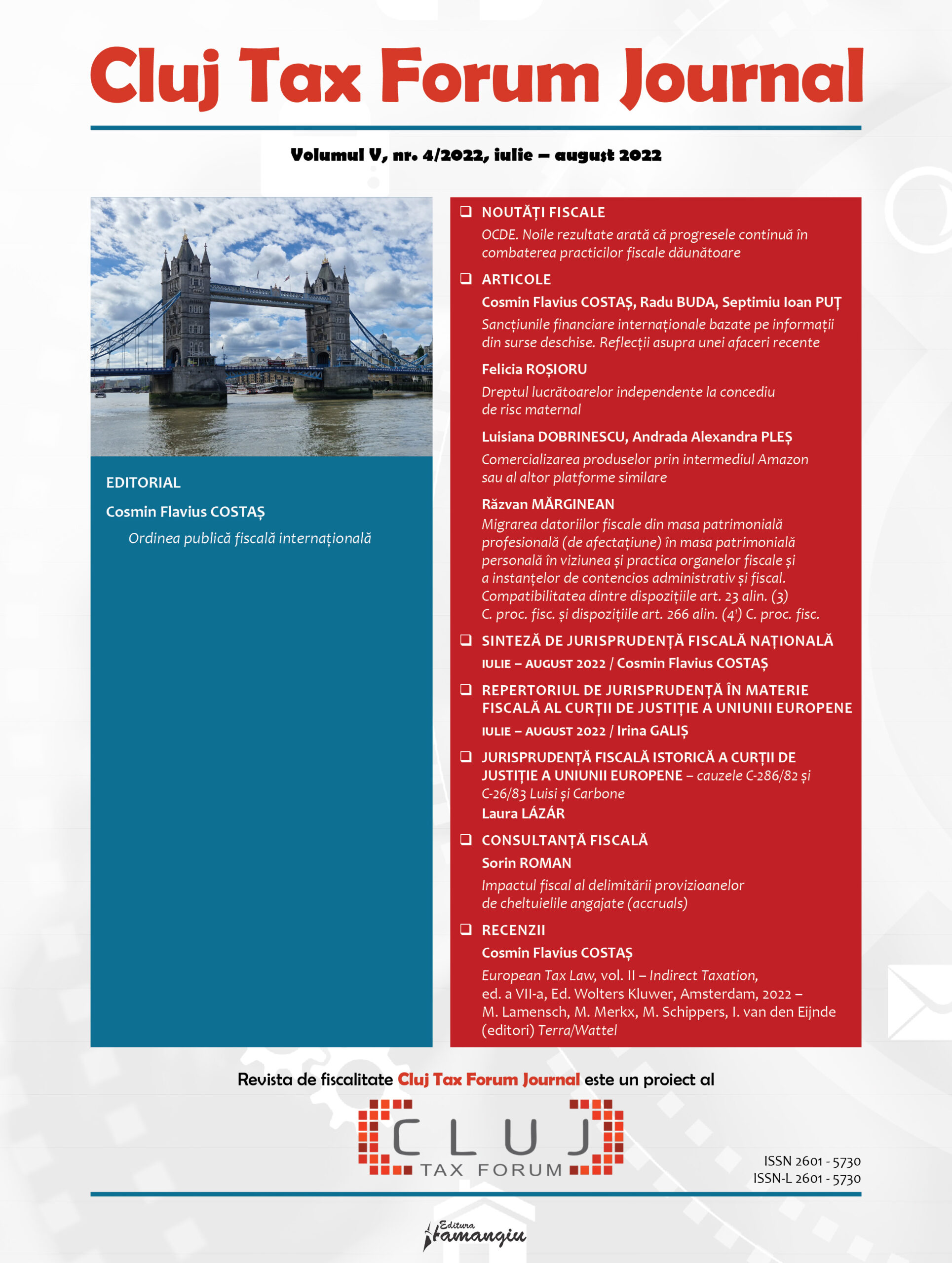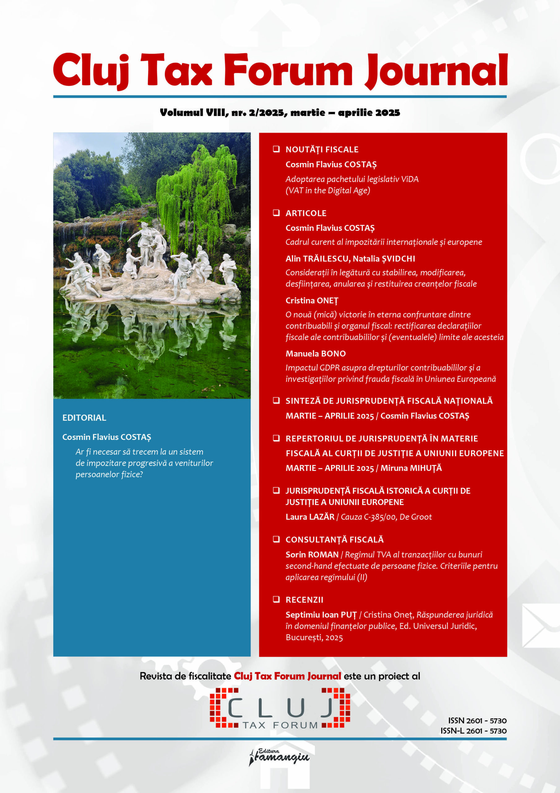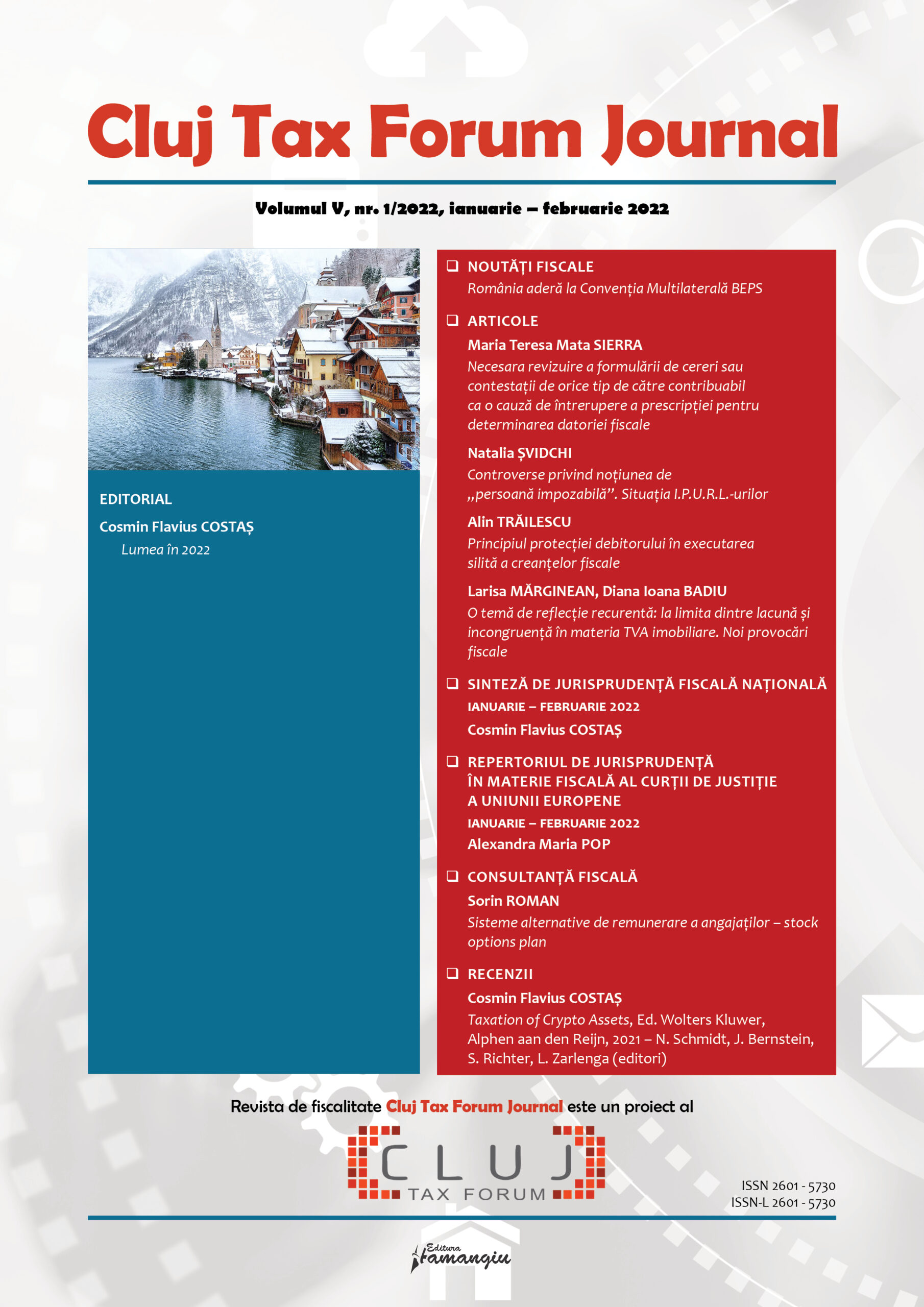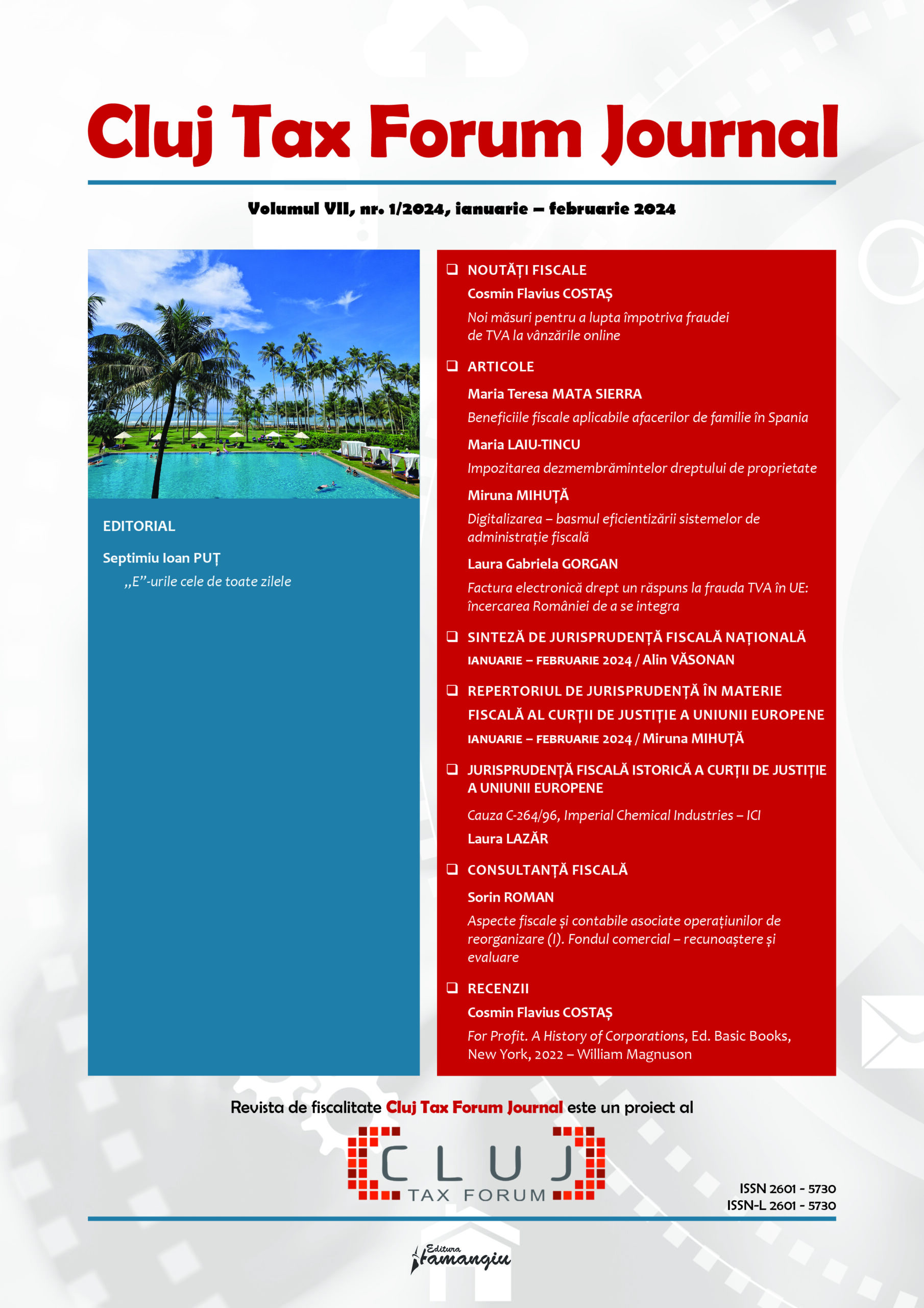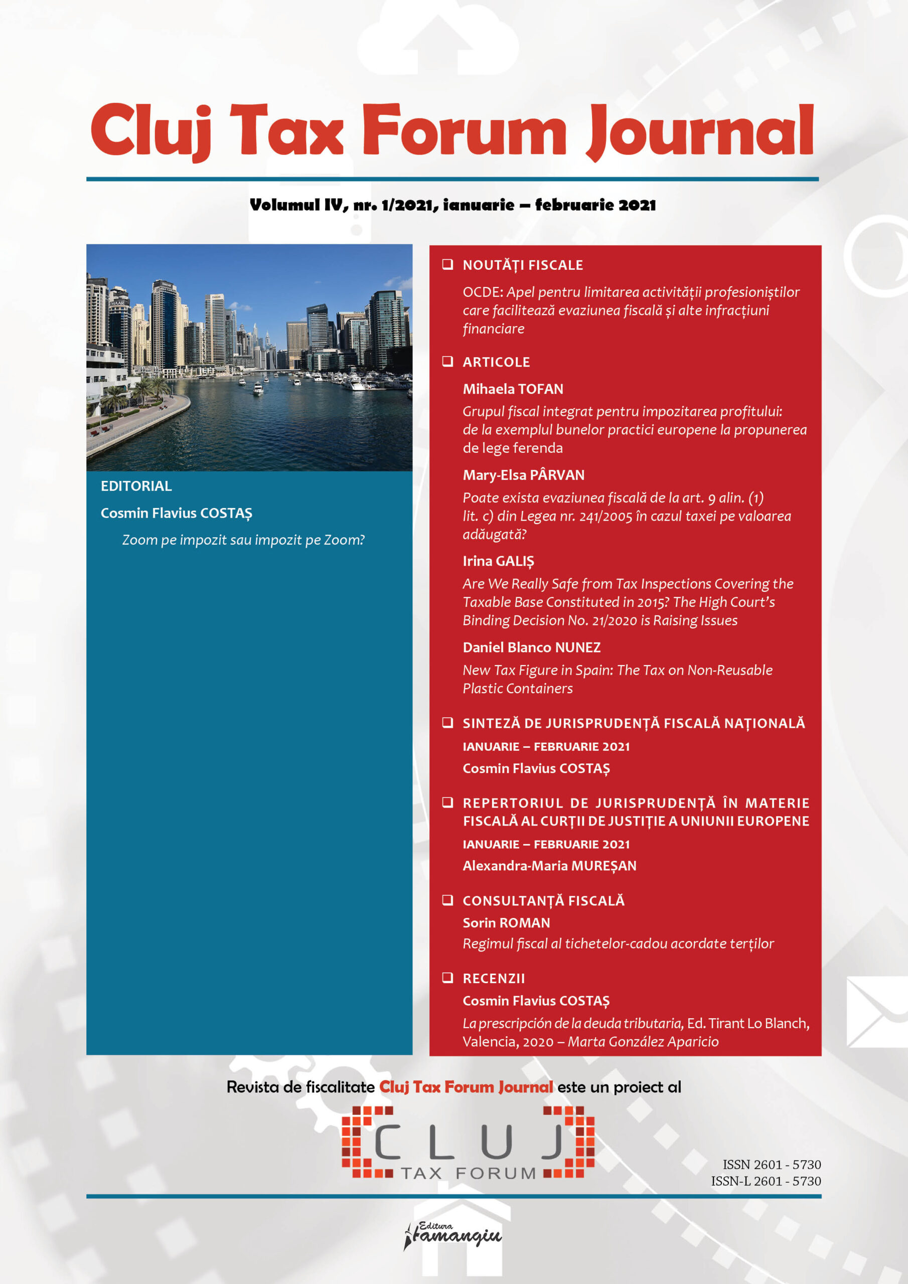 Revista Cluj Tax Forum Journal apare cu începere din anul 2018, în marja seriei de conferințe de fiscalitate Cluj Tax Forum. De la început, revista și-a propus să ofere oportunități de publicare atât cercetătorilor consacrați, din țară și din străinătate, cât și tinerilor studenți, masteranzi sau doctoranzi. Cluj Tax Forum Journal apare bilunar, în format tipărit pe hârtie, la Editura Hamangiu (pentru detalii și abonamente, https://www.hamangiu.ro/periodice).