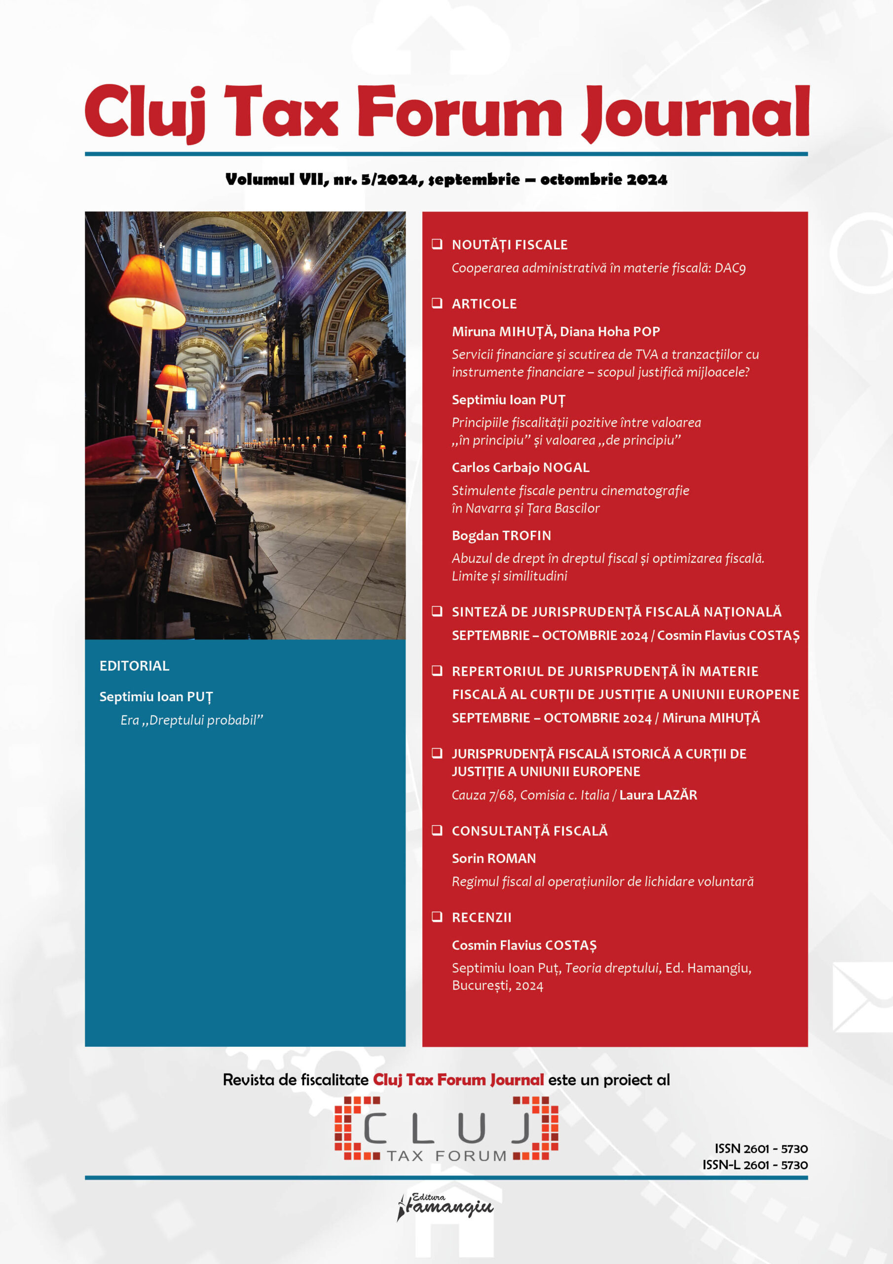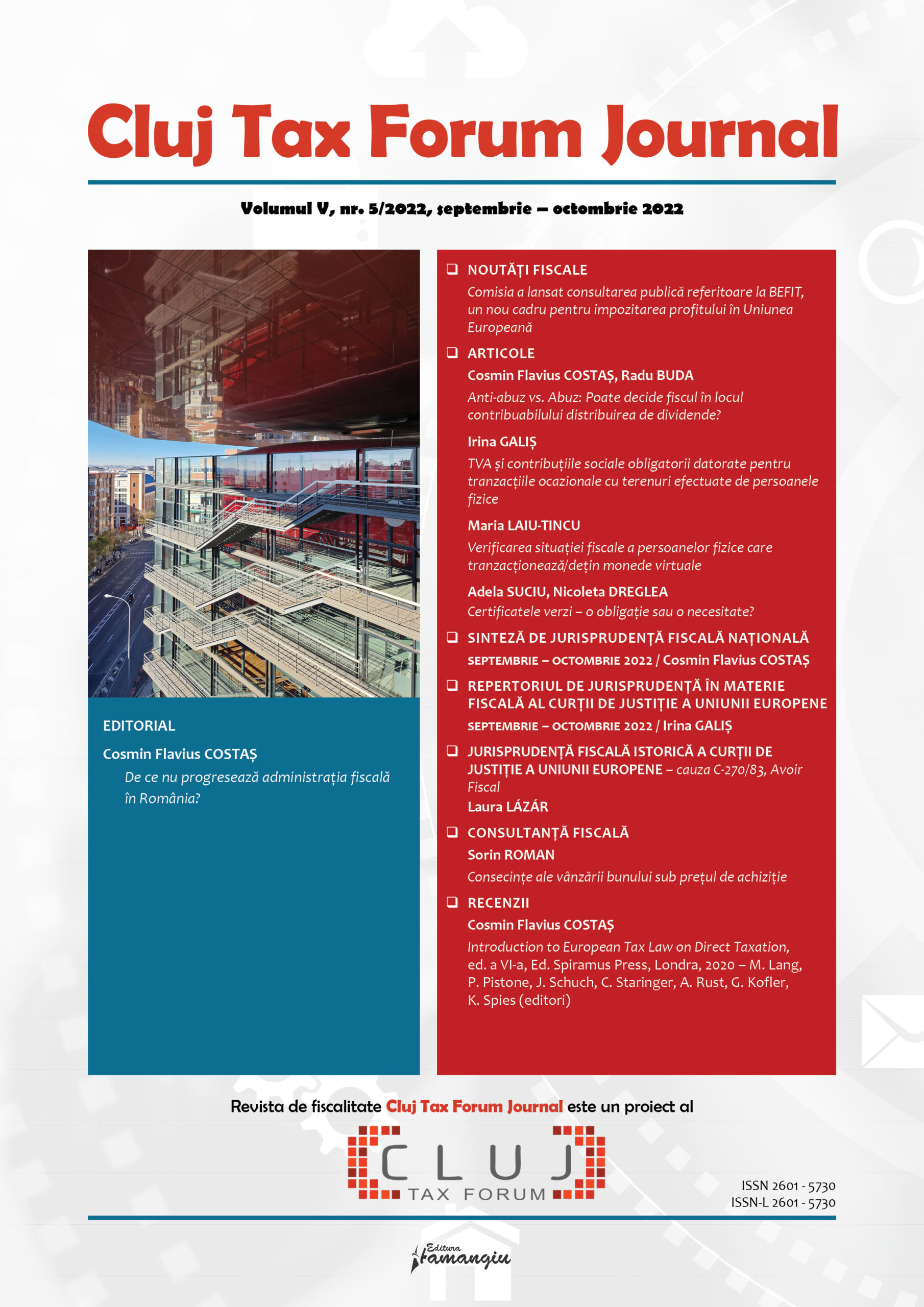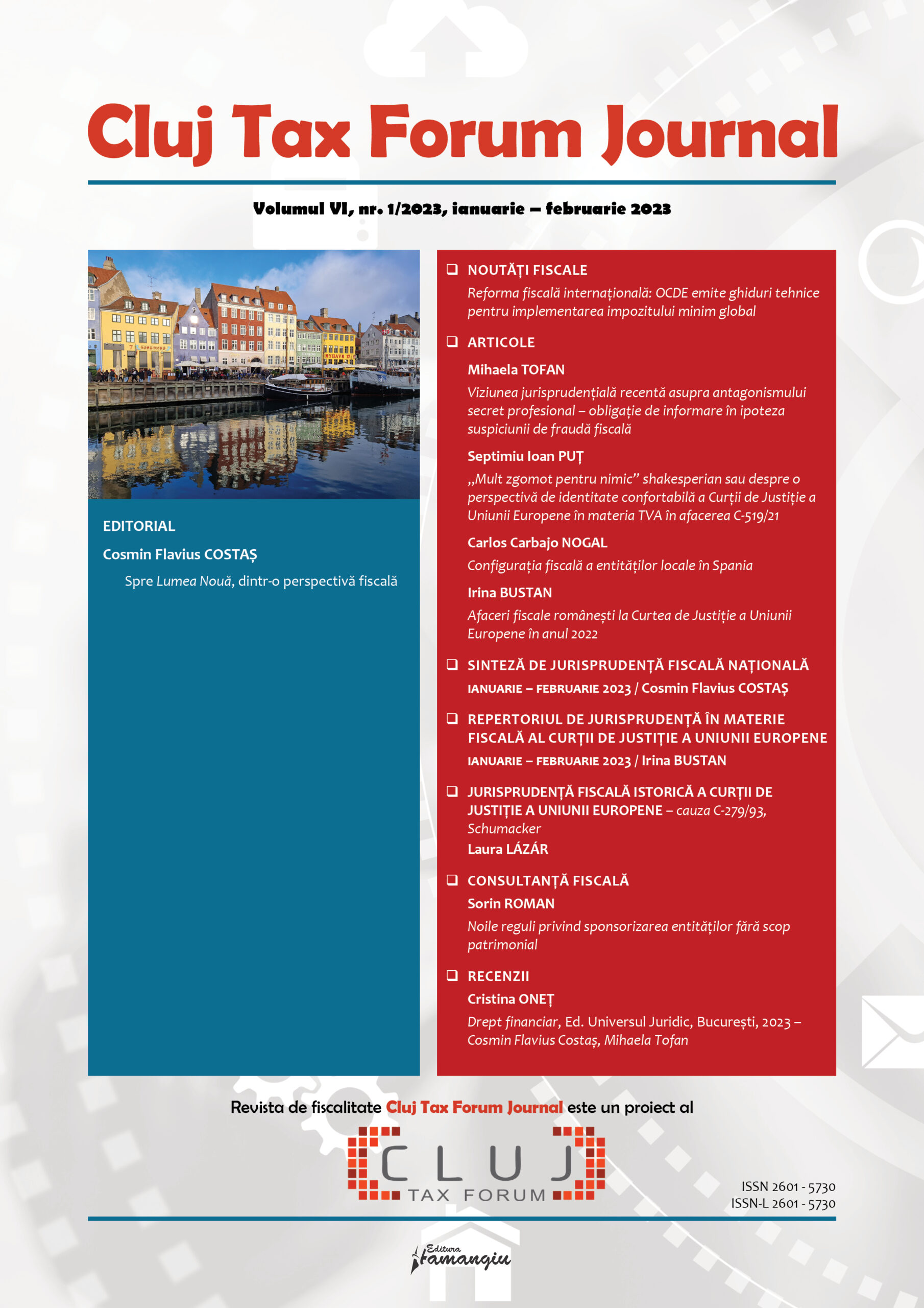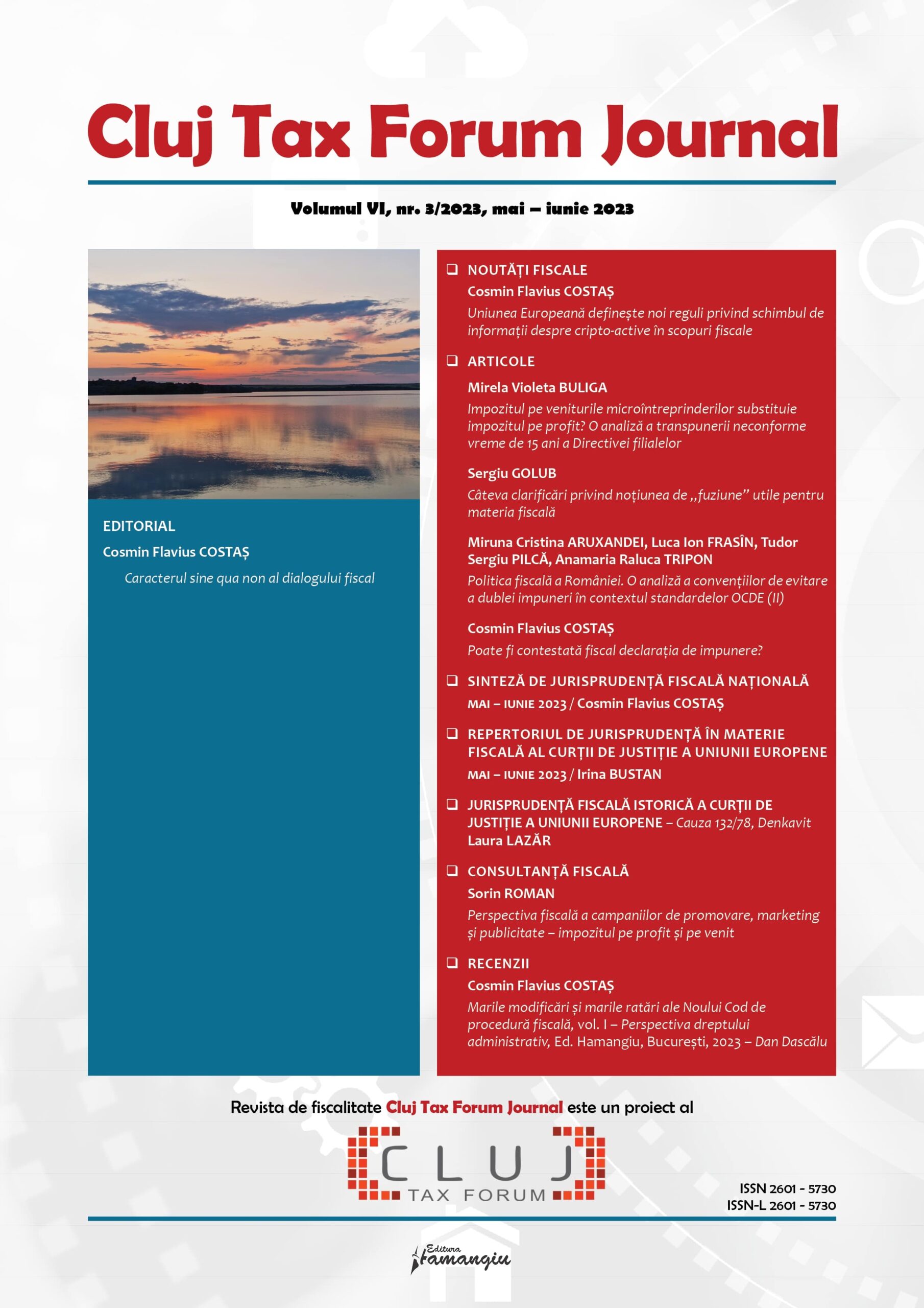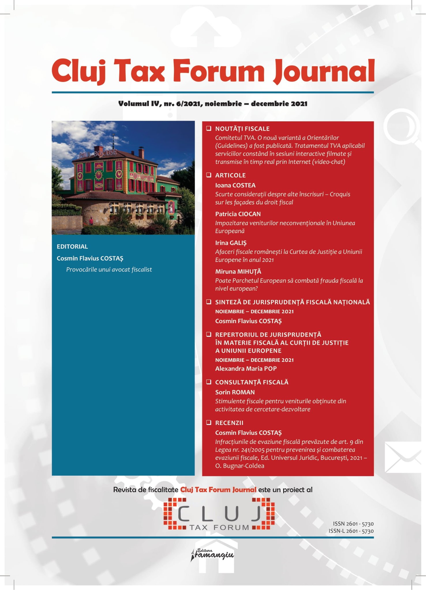 Revista Cluj Tax Forum Journal apare cu începere din anul 2018, în marja seriei de conferințe de fiscalitate Cluj Tax Forum. De la început, revista și-a propus să ofere oportunități de publicare atât cercetătorilor consacrați, din țară și din străinătate, cât și tinerilor studenți, masteranzi sau doctoranzi. Cluj Tax Forum Journal apare bilunar, în format tipărit pe hârtie, la Editura Hamangiu (pentru detalii și abonamente, https://www.hamangiu.ro/periodice).